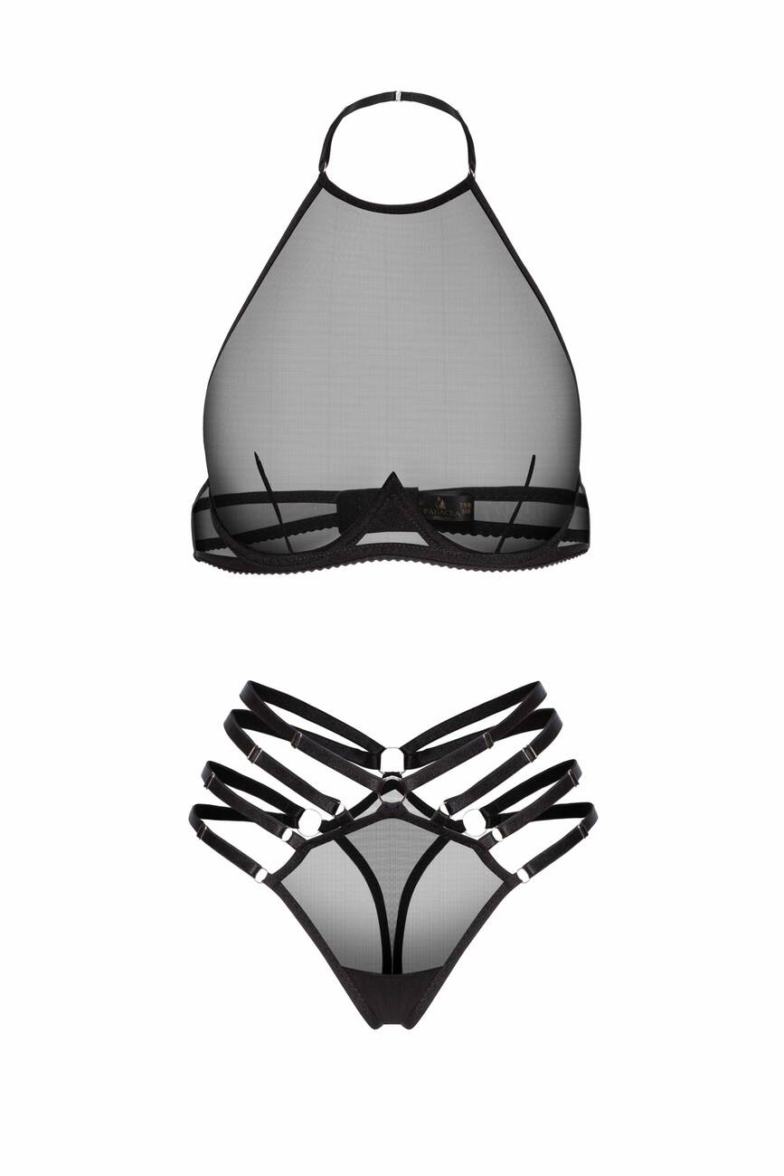 Комплект білизни із еластичної сітки. Холтер-бра з кісточками, трусики стрінги, регулюються з боків. Пояс для панчох з натурального страусиного пір'я можна придбати окремо (арт. 302).